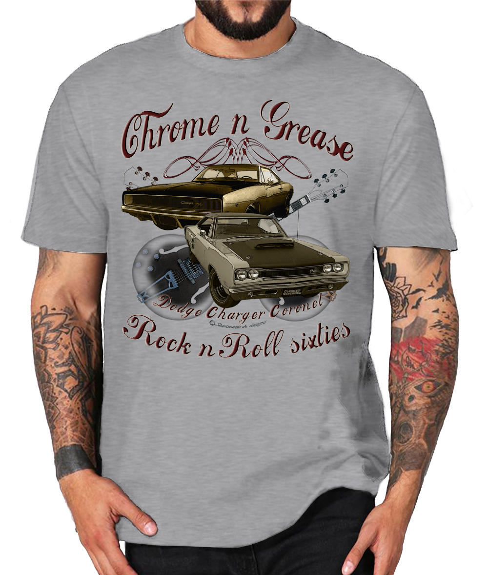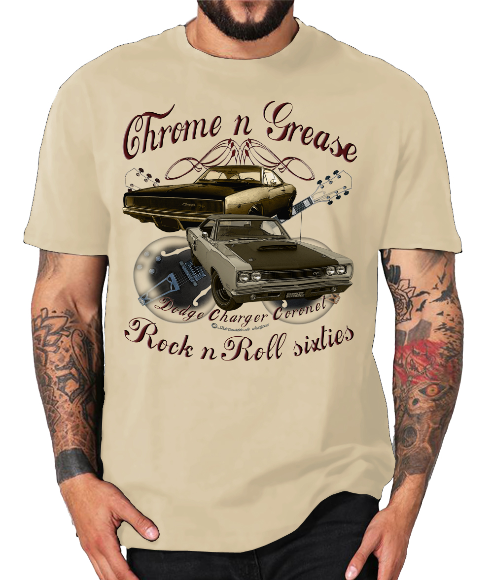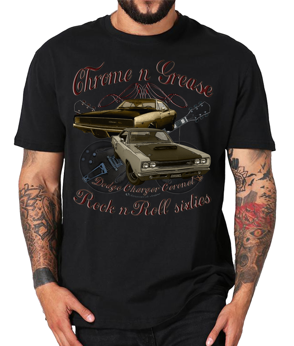 Amerikanischer Lifestyle, Donnernde V8 Motoren, Pinup Girls, gepflegte Spritvergeudung, Rock n Roll und Rockabilly ~Sie erhalten ein exklusives T-Shirt aus der SHIRTMATIC Motor & Rock Design Kollektion Chrome N Grease 60s Dodge Charger Coronet Guitars 50s Rock N Roll T-Shirt Vintage DESIGN Shirt