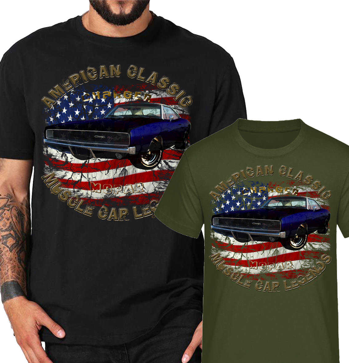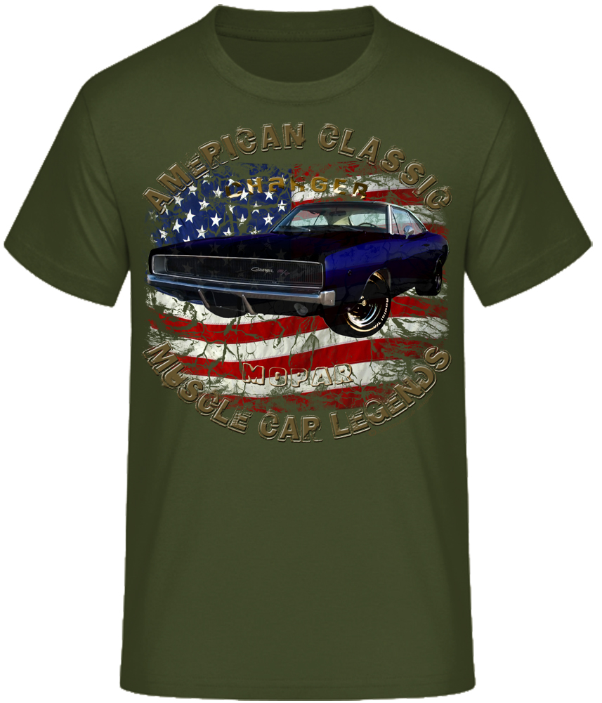 Classic Charger 68 color USA Flagge Amerikanischer Lifestyle, Donnernde V8 Motoren, gepflegte Spritvergeudung, Rock n Roll und Rockabilly. Sie erhalten ein exklusives Dodge Charger USA flag Vintage Car Designer T-Shirt aus der SHIRTMATIC Motor & Rock Design Kollektion