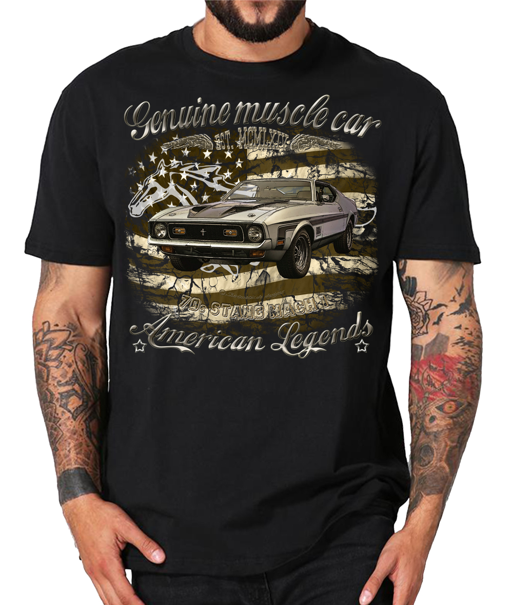 Mustang vintage legends 70s Mach1 USA Muscle car Pony Ford V8 SHIRTMATIC Designer Shirts – Amerikanischer Lifestyle, Donnernde V8 Motoren, gepflegte Spritvergeudung, Rock n Roll und Rockabilly ~Sie erhalten ein exklusives T-Shirt aus der SHIRTMATIC Design Kollektion US cars / Muscle cars, Pony cars, Ford Mustang Legends Mustang der 60er und 70er Jahre. GT, V8, Shelby. Sie haben die Wahl des angebotenen Designs Ford Mustang Illustration, in T-Shirt Größen von S – 5XL in Shirtfarbe schwarz, grau und oliv (military)