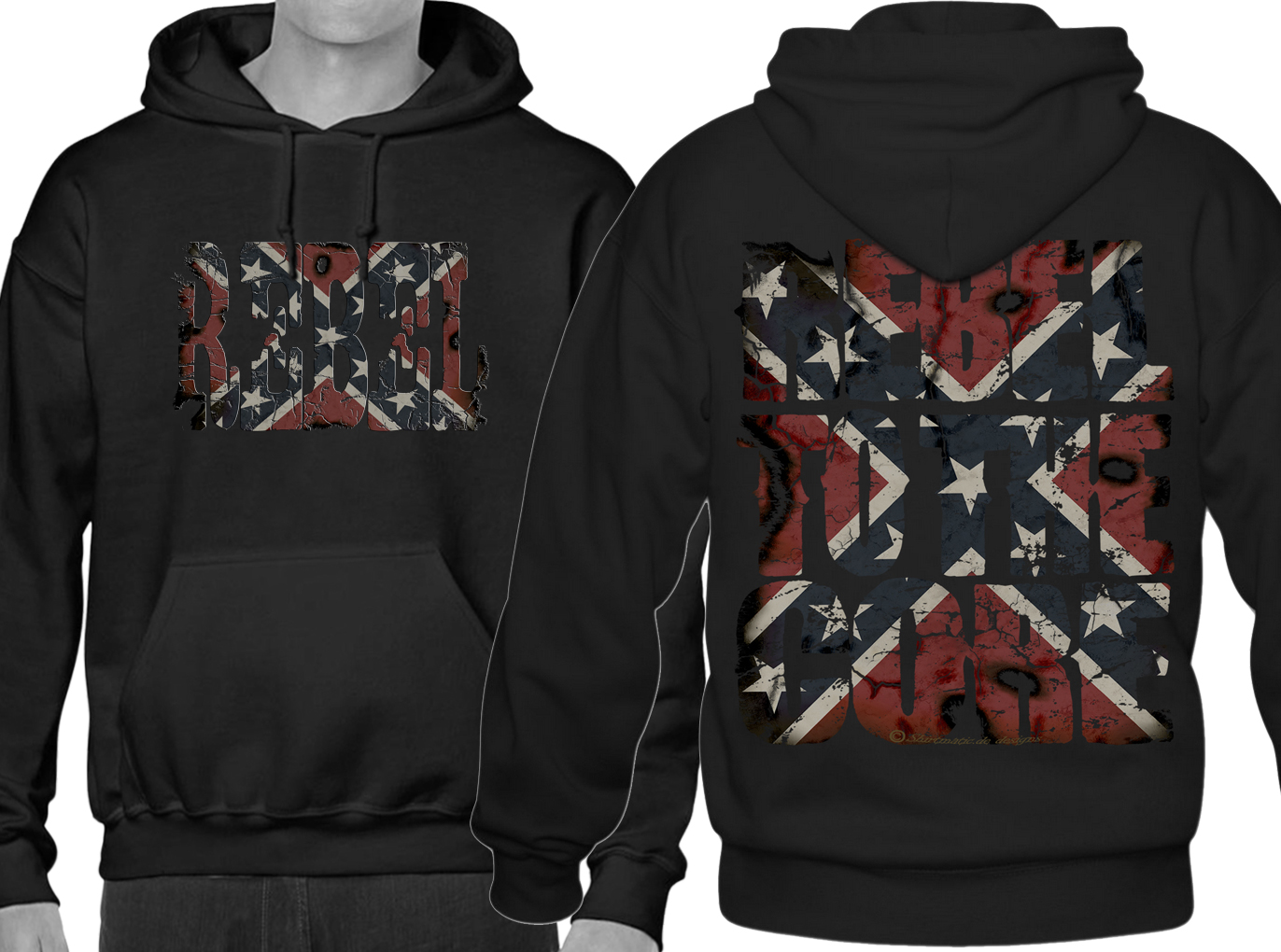 Sie wählen personalisierte Hoodies aus der SHIRTMATIC Design Kollektion US cars / Muscle cars, Hot Rod Legends Varianten mit Rebel Brustaufdruck und Rebel to the core flag Rückenaufdruck !