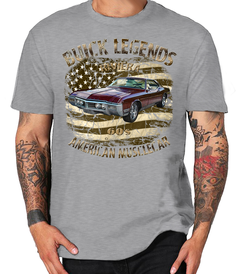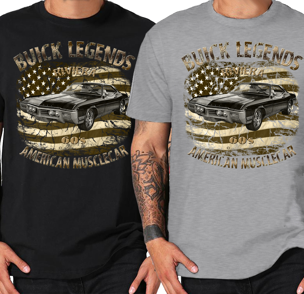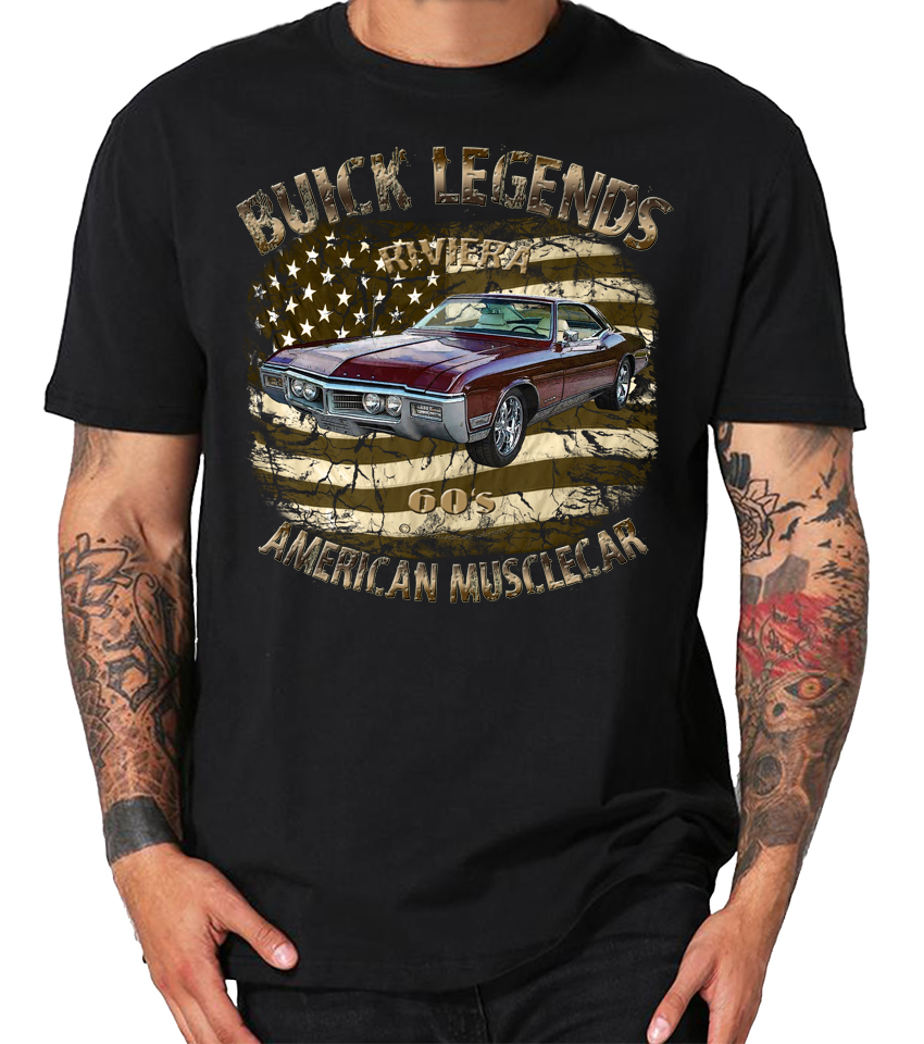 Shirtmatic 60s Buick classic muscle car legends classic Oldtimer Shirt Amerikanischer Lifestyle, Donnernde V8 Motoren, Pinup Girls, gepflegte Spritvergeudung, Rock n Roll und Rockabilly ~Sie erhalten ein exklusives T-Shirt aus der SHIRTMATIC Motor & Rock Design Kollektion Chrome N Grease Guitars 50s Rock N Roll T-Shirt Vintage DESIGN Shirt : 1969 Buick Riviera mit Headlights